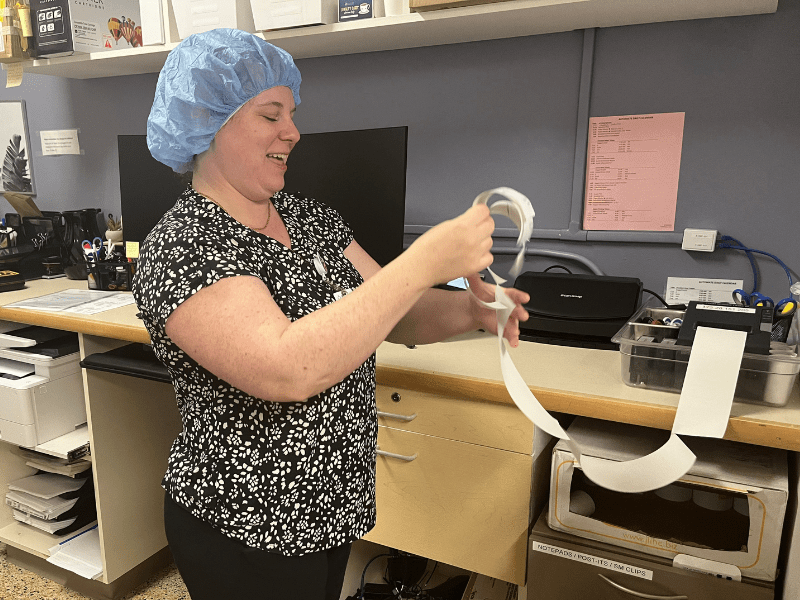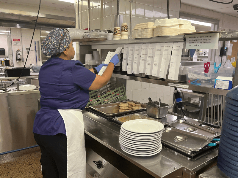 The dietary aides carefully review each printed order and organize them, setting the stage for the kitchen team to start preparing meals. Their attention to detail helps ensure every patient receives the right meal, exactly when they need it.