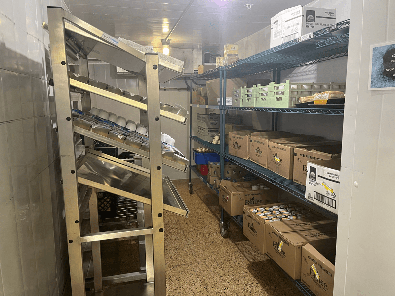 The kitchen is equipped with two walk-in coolers, like the one shown here, and a large freezer. These storage spaces keep perishables fresh and ready, ensuring ingredients are on hand throughout the week for meal preparation..