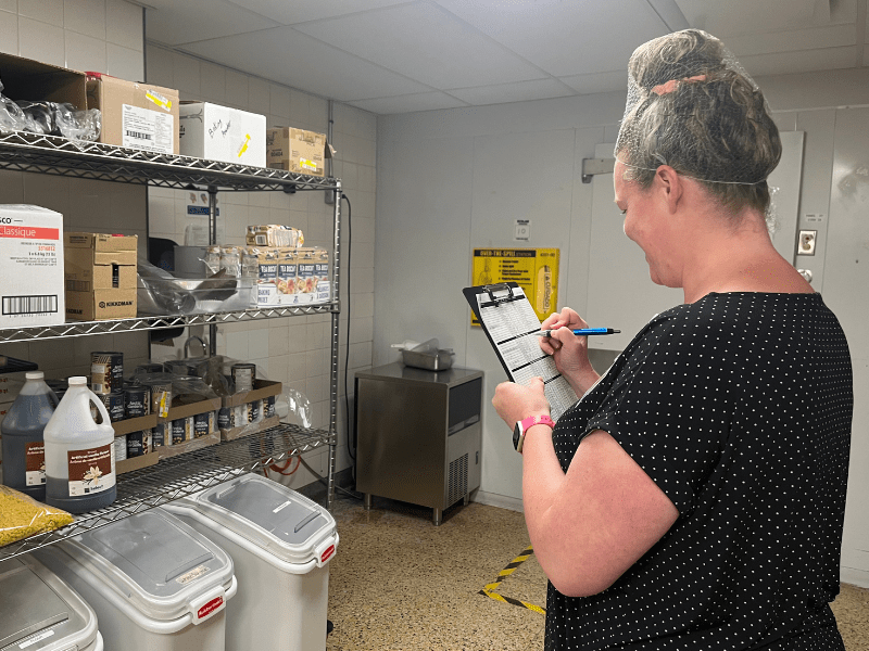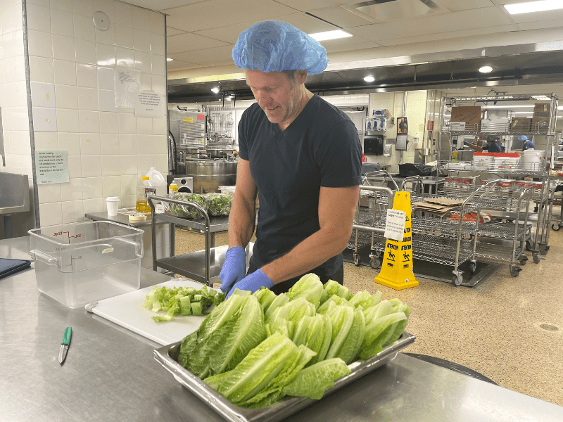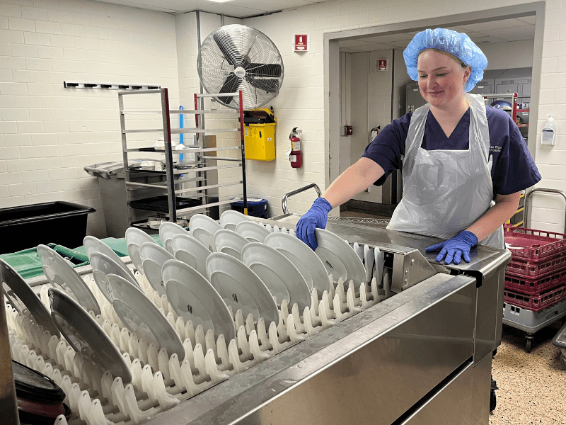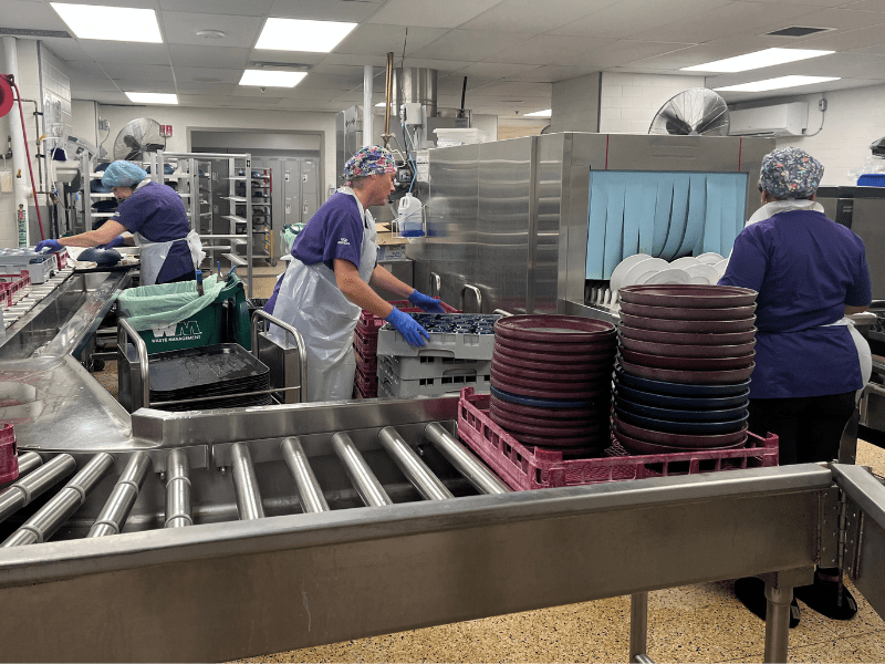 After each meal, the team swings into action. One staff member strips the trays, another sorts the dishes and stacks them neatly, while a third loads the dish machine, ensuring everything is quickly washed, sanitized, and ready for the next meal.