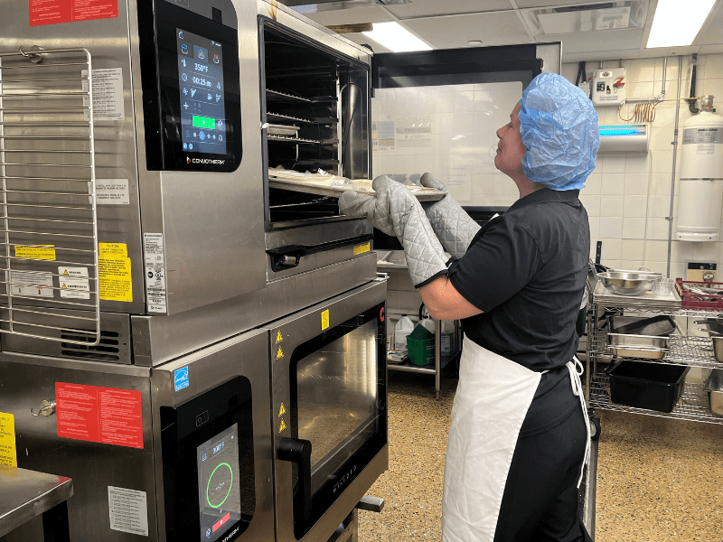 We could all dream of an oven like this at home! Here, the cook slides in a tray of chicken breasts, ready to cook them to perfection for our patients’ meals.