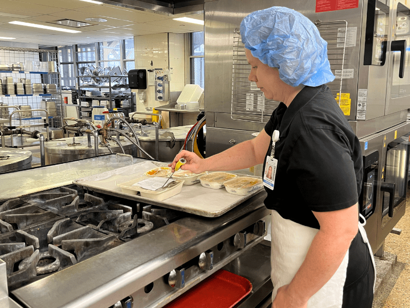 When the meals come out of the oven, the cook checks their temperature, making sure every dish meets safety standards before it heads to the patients.