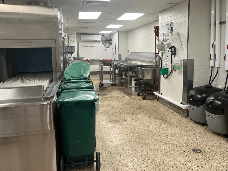 The calm before the storm! After every meal, the Dish Room is thoroughly cleaned and sanitized, readying the space for the next round of trays.
